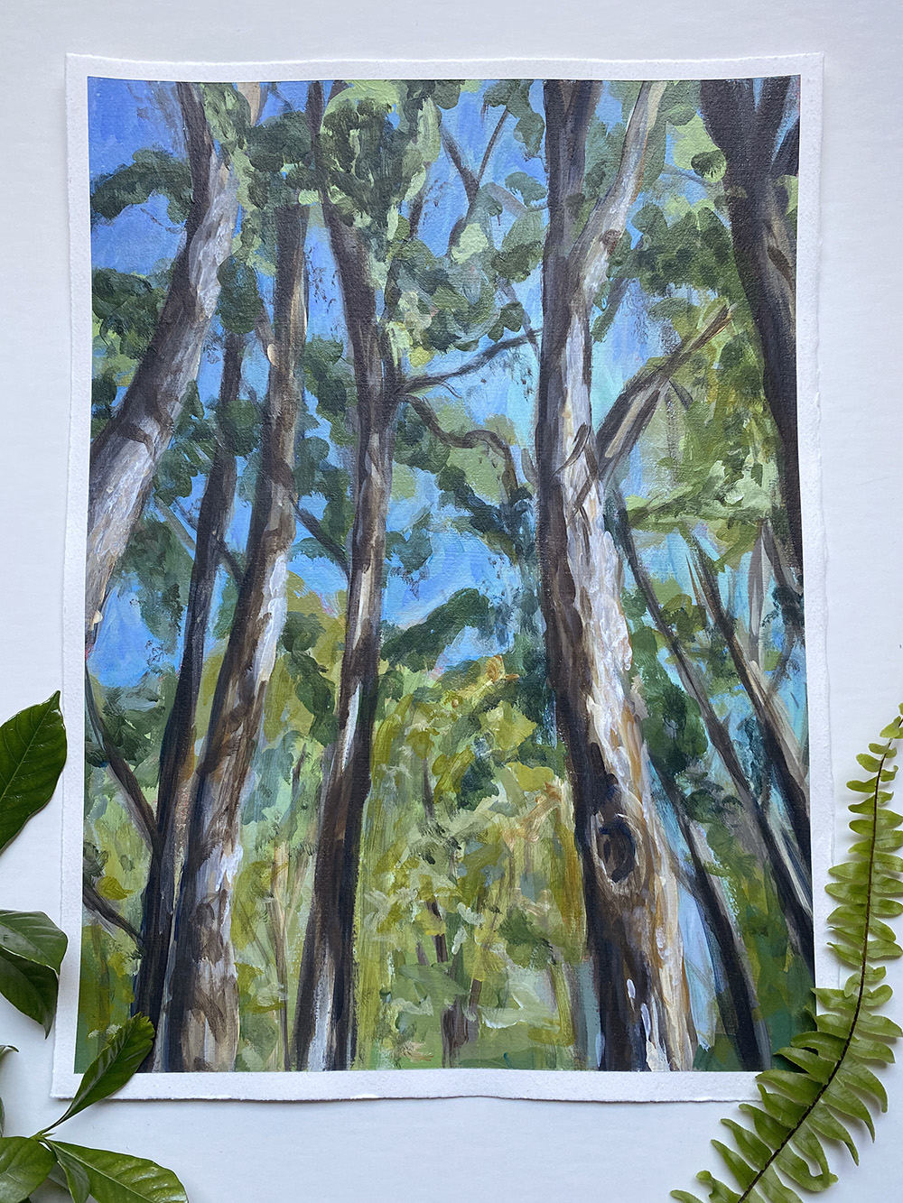 This painting was painted from the pine tree grove in the backyard of my grandparent’s home. As a child I played butterflies there, swirling and twirling around in their shadows, through the needles below. These trees offer a sense of calm, peaceful refuge underneath their tall canopy, much like my grandparents’ legacy and influence in my life. I enjoyed exploring the play of light and shadow in this painting.