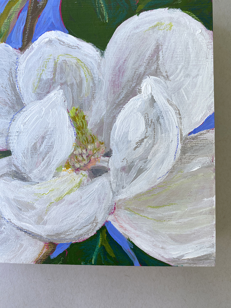 Acrylic, gouache, and pastel on wood panel, sealed with a satin finish